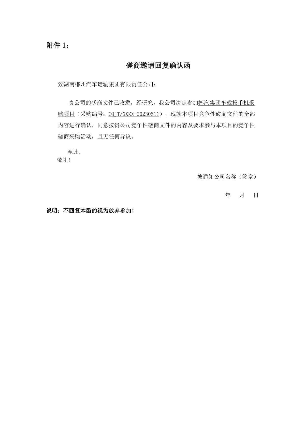 你单位收到磋商文件后,请于2023年5月26日17时前来函确认是否参加竞争性磋商采购活动。若未收到你方书面确认,将视为你方已放弃参加本项目竞争性蹉商采购活动(格式见附件1)。
